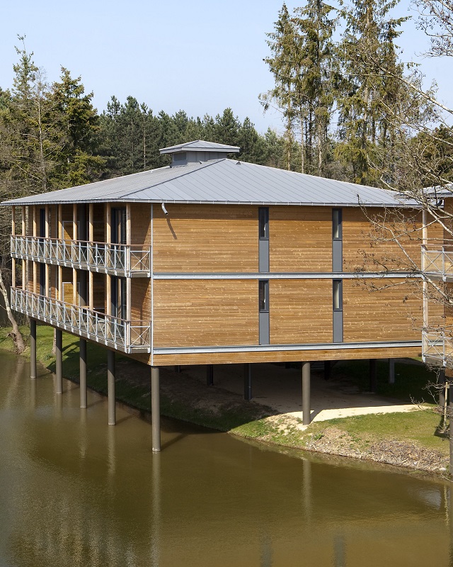Les matériaux utilisés (béton, parement de bois, zinc) ont été choisis parce qu’ils ne nécessitent peu ou pas d’entretien. Le zinc a été préféré à l’ardoise, matériau régional, car il permet d’obtenir une pente plus faible et peut être recyclé, dans l’hypothèse de la destruction du complexe. Ce qui en revanche n’est pas classique, ce sont les pilotis sur lesquels sont perchés les logements. Ils n’évoquent pas l’architecture lacustre par hasard : le parc est en zone inondable, et si en 2004 le plan d’urbanisme y autorisait encore les constructions, l’architecte s’était lui-même fixé un certain nombre de règles permettant d’adapter les édifi ces à cette contrainte. Les bâtiments doivent faciliter le libre écoulement des eaux, assurer la salubrité des biens et des personnes, respecter la faune et la flore et enfi n faire l’articulation entre l’architecture et le paysage. Ce dernier objectif, plus difficile à